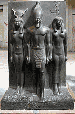 The Pharao stands between Hut-Sekhem (Hiw, Sistrum) and Hathor, as indicated in the Pyramid. |